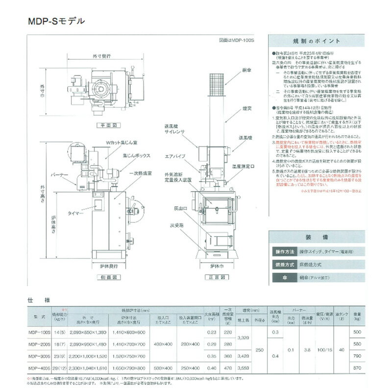 【代引不可】 【個人宅配送不可】 焼却炉 廃プラ対応 消煙タイプ 型式:MDP-300S 焼却能力(Kg/h) :23(9) 火床面積(m2) :0.35 一次燃焼室容積(L) :360 ●基本設計を細部まで徹底的に見直すことで、使い勝手の向上と、より一層の耐久性アップを追求しました。